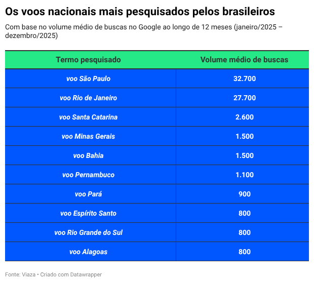 O estudo foi realizado pelo Viaza, agência de viagens referência na venda de passagens aéreas baratas, que considerou o volume de buscas no Google Brasil entre janeiro e dezembro de 2025.