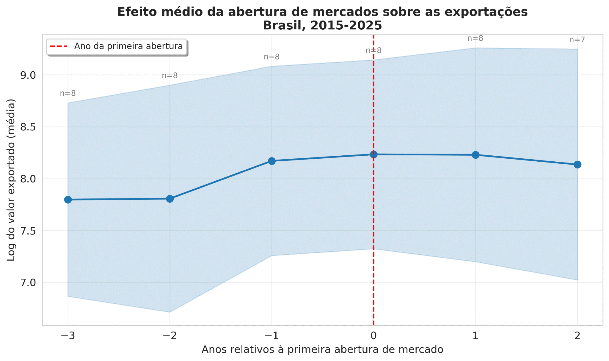 A análise econométrica reforça essa leitura. Quando estimamos um modelo com efeitos fixos de produto e ano, o impacto contemporâneo da abertura de mercado sobre o valor exportado não se mostra estatisticamente significativo. Embora os anos com abertura apresentem, em média, valores maiores, esse efeito desaparece ao controlarmos por heterogeneidades estruturais e choques comuns. Isso sugere que a abertura é condição necessária, mas não mecanismo automático de expansão exportadora.