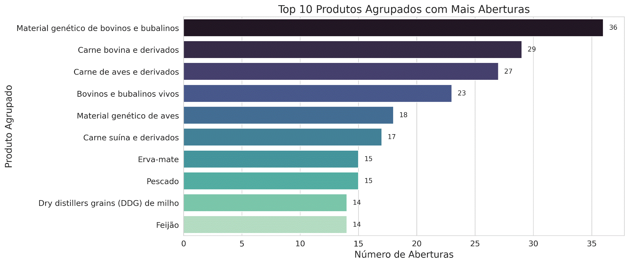 Entretanto, o dado mais disruptivo surge quando analisamos os produtos que lideram as aberturas. O item com maior número de registros não é uma commodity tradicional, mas material genético de bovinos e bubalinos, seguido por carnes processadas, genética avícola e produtos com elevada complexidade regulatória. Trata-se de segmentos com maior conteúdo tecnológico, exigência sanitária sofisticada e relacionamento institucional prolongado.