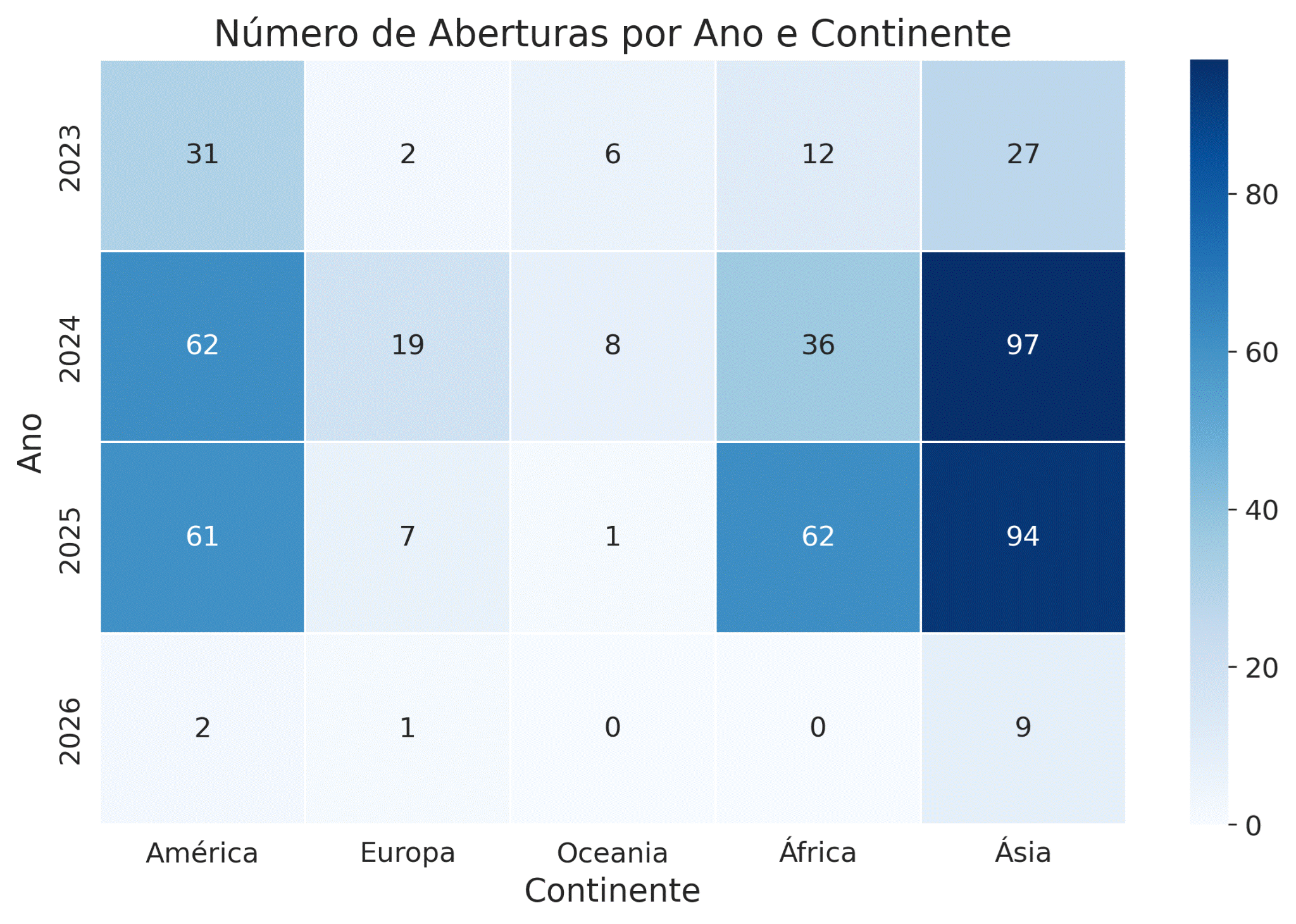 Figura 3 – Heatmap de aberturas por continente e ano