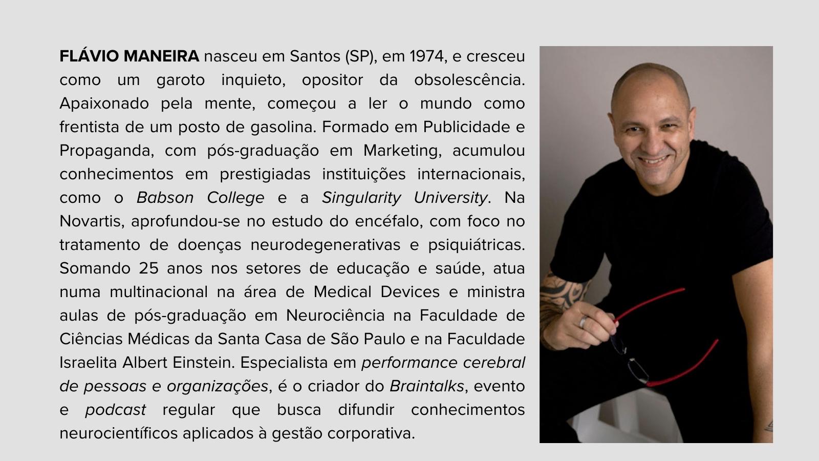 Uma viagem inédita ao cérebro, à mente e à forma como os pensamentos são construídos e levam à ação do ser humano, para o bem ou para o mal. Assim se pode definir “Neuromanagement – Cérebro e a gestão de pessoas e organizações”, surpreendente livro do professor de neurociência Flávio Maneira. Ele tem passado os últimos anos fazendo palestras sobre o cérebro e como melhor usá-lo, inclusive para os negócios, no Brasil e no exterior.