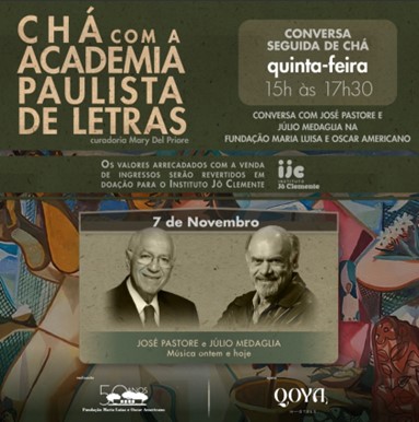 No dia 07 de novembro (quinta-feira), a Fundação Maria Luisa e Oscar Americano vai sediar um bate-papo entre dois membros da Academia Paulista de Letras. A partir das 15h, o sociólogo José Pastore e o maestro e arranjador Júlio Medaglia conversarão sobre o poder transformador da música e mais especificamente sobre os impactos positivos da Orquestra Sinfônica Heliópolis (OSH) na vida dos jovens dessa comunidade, que é a segunda maior da América Latina.