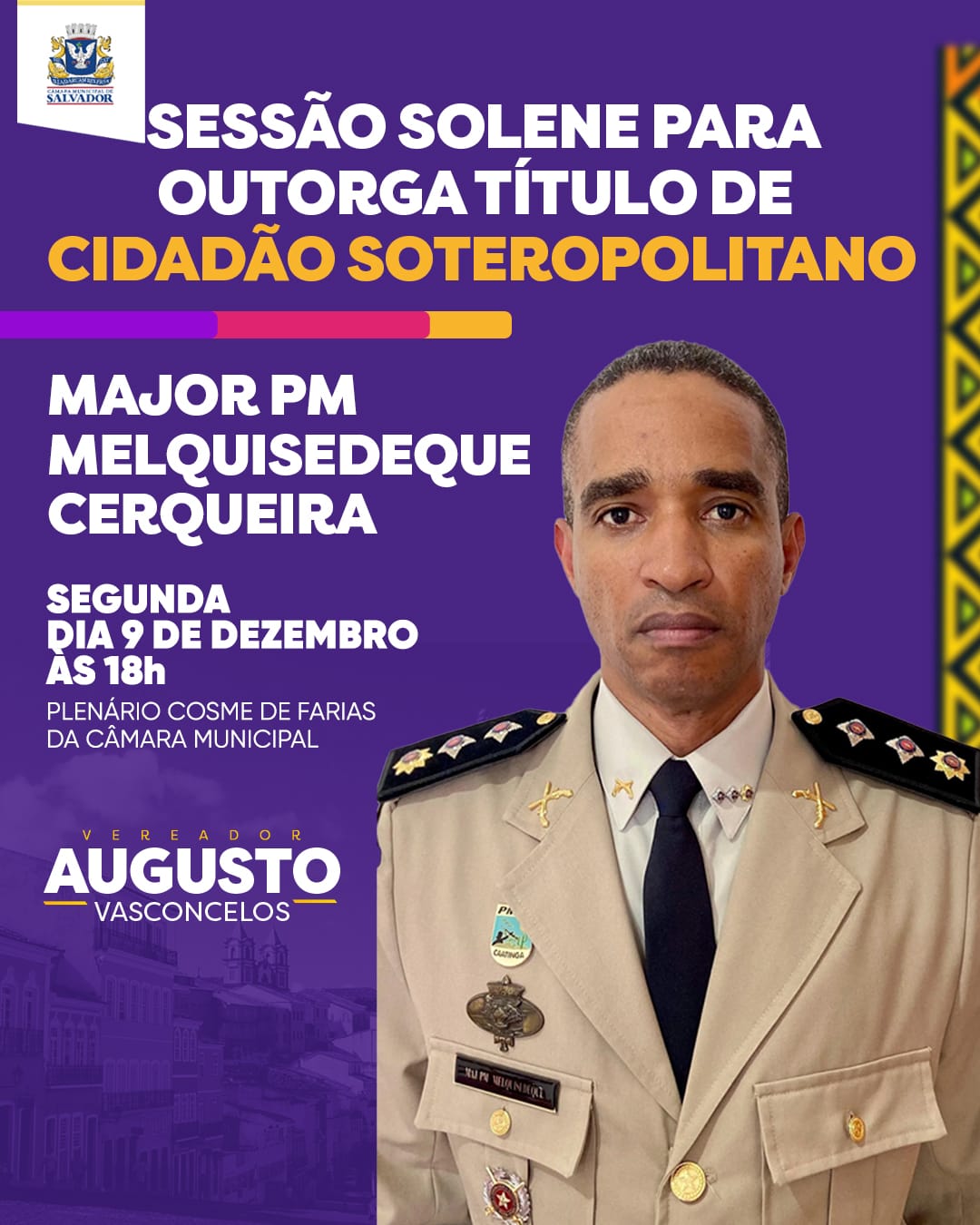Por iniciativa do vereador Augusto Vasconcelos (PCdoB), a Câmara Municipal de Salvador (CMS) concederá, nesta segunda-feira (09), o Título de Cidadão Soteropolitano ao Major da Polícia Militar da Bahia, Melquisedeque Cerqueira. A solenidade está marcada para as 18h, no Plenário Cosme de Farias, localizado na sede da CMS.