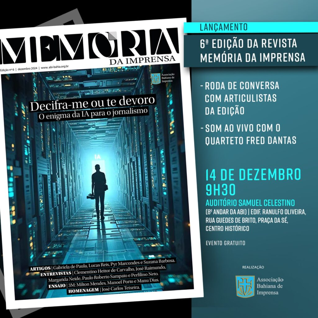 A Associação Bahiana de Imprensa (ABI) promove neste sábado, 14 de dezembro, o lançamento da 6ª edição da Revista Memória da Imprensa, uma publicação que preserva, como relíquia viva, os relatos de quem moldou o jornalismo baiano ao longo das últimas décadas. Às 9h30, a instituição receberá, no Auditório Samuel Celestino, na Praça da Sé (Centro Histórico), jornalistas e fotojornalistas, pesquisadores e apaixonados pela comunicação e pela cultura.